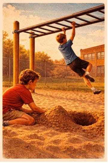 It was a late-summer afternoon outside the middle school. A boy played alone on the monkey bars.